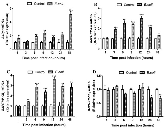 Responses of Dpt and BdPGRPs to opportunistic pathogen E. coli challenges. Relative expression of Dpt (A), BdPGRP-LB (B), BdPGRP-SB1 (C), and BdPGRP-SC2 (D) after infection with E. coli at different time points, respectively. The data are expressed as mean ± SEM and the mean refers to the average of four biological replicates for each sample. Statistical analysis was based on Student’s t-test. * p < 0.05; ** p < 0.01; *** p < 0.001. The relative gene expression data were analyzed using a 2−ΔΔCT method and the data were normalized to reference gene Rpl32.