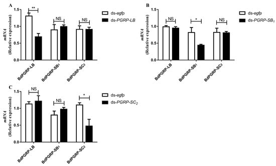 Off-target detection after dsRNA injection. (A) Influence of silencing BdPGRP-LB on expression of BdPGRP-SB1 and BdPGRP-SC2. (B) Influence of silencing BdPGRP- SB1 on expression of BdPGRP-LB and BdPGRP-SC2. (C) Influence of silencing BdPGRP- SC2 on expression of BdPGRP-LB and BdPGRP-SB1. All error bars represent the SEM of the mean of three independent biological replicates. Statistical analysis was based on Student’s t-test. * p < 0.05; ** p < 0.01; NS, no significant difference; p > 0.05. The relative gene expression data were analyzed using a 2−ΔΔCT method and the data were normalized to reference gene Rpl32.