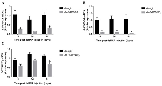 RNA interference efficiency of BdPGRPs. Relative expression of PGRP-LB (A), PGRP-SB1 (B), and PGRP-SC2 (C) after dsRNA injection at different time points with whole body samples. All error bars represent the SEM of the mean of three independent biological replicates. Statistical analysis was based on Student’s t-test. * p < 0.05; ** p < 0.01. The relative gene expression data were analyzed using a 2−ΔΔCT method and the data were normalized to reference gene Rpl32.