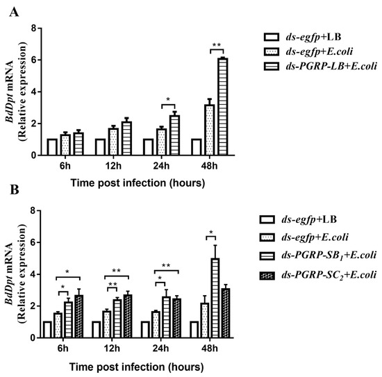 3.3. Responses of BdPGRPs to Systemic Bacterial Infection