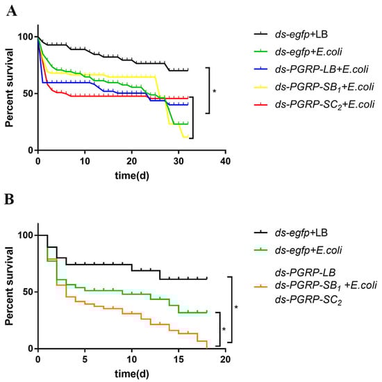 Survival rate of B. dorsalis after BdPGRPs RNAi followed by E. coli infection. (A) Three BdPGRPs were knocked down separately. (B) Three BdPGRPs were knocked down at the same time. Statistical analysis was based on Log-rank (Mantel–Cox) test (* p < 0.05).
