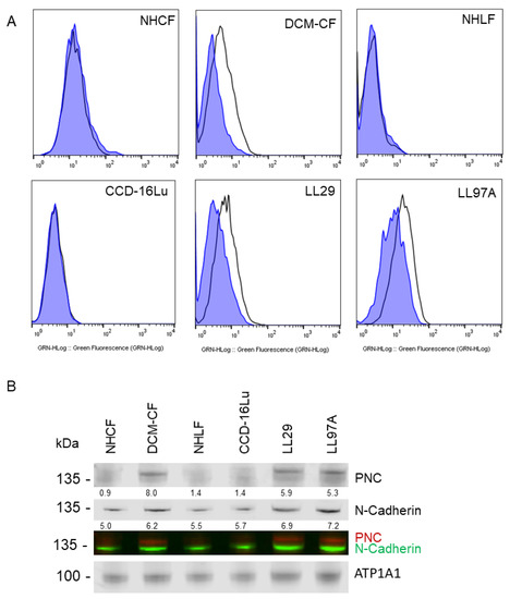PNC is localized to the cell surface of myofibroblasts. Myofibroblasts from heart and lung tissues were stained and analyzed by flow cytometry using m-α-PNC mAb 10A10, excluding debris and dead cells via gating and 7AAD exclusion using Flowjo software. Myofibroblasts from fibrosis origins stain positive for cell surface PNC: (A) CF-DCM, cardiac myofibroblasts from dilated cardiomyopathy; Chi-Squared = 177.5; SE Dymax % Positive = 48.0. LL97A, IPF; Chi-Squared = 93.4; SE Dymax % Positive = 54.8, and LL29, IPF; Chi-Squared = 113.5; SE Dymax % Positive = 51.0. PNC was not detected on the surface of primary normal human cardiac myofibroblasts from healthy donor, NHCF; Chi-Squared = 3.47; SE Dymax % Positive = 8.54, primary normal human lung myofibroblasts from healthy donor, NHLF; Chi-Squared = 0; SE Dymax % Positive = 0, or immortalized CCD-16Lu lung myofibroblasts from healthy donor; Chi-Squared = 0; SE Dymax % Positive = 0. Mouse IgG1 isotype control (blue shaded) was compared to m-α-PNC mAb (unshaded). Results are representative of 3 independent experiments, n = 3. For all flow cytometry experiments, Chi-squared ≥ 4 is statistically significant. (B) Cell surface proteins were isolated from myofibroblasts and immunoblotted for N-cadherin, PNC, and Na,k-ATPase α-1 (ATP1A1) cell surface compartment loading control. PNC and N-Cadherin lysates were normalized to the ATP1A1 cell surface loading control for each sample and are reported as a relative value below each band.