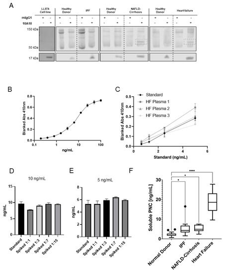 Feasibility and development of a PNC ELISA. (A) Soluble PNC product was immunoprecipitated from LL29 conditioned media and patient plasma from pooled healthy donors, IPF patients, NAFLD-Cirrhosis patients and cardiomyopathy patients using m-α-PNC mAb 10A10 compared to mouse IgG1 isotype control (mIgG1) and immunoblotted. (B) Recombinant prodomain analyte was serially diluted in duplicate starting at 100 ng/mL in standard diluent and measured by ELISA to determine the range of the standard. (C) Linearity of endogenous analyte was measured. Plasma from patients with heart failure was serially diluted 1:3, 1:7, 1:15, 1:31 in standard diluent and sPNC was measured by ELISA in duplicate. All linear regression r2 values were calculated to be within acceptable range (r2 ≥ 0.99). (D,E) Healthy donor plasma was diluted in standard diluent to indicated dilutions (1:1, 1:3, 1:7, 1:15) then spiked with recombinant prodomain analyte at 10 ng/mL (D) and 5 ng/mL (E) and analyzed by ELISA. Recovery of analyte was quantified and compared to back calculation of the standard. All dilutions were within the consensus range of 20 percent ± the standard back calculations at concentrations 10 ng/mL and 5 ng/mL. (F) Plasma was assayed for sPNC from healthy controls (n = 26), patients with IPF (n = 9), NAFLD with cirrhosis (n = 12), and cardiomyopathy (n = 9). Ordinary one-way ANOVA analysis with Dunnett’s multiple comparisons test was performed to determine significance (* p ≤ 0.05, **** p ≤ 0.0001).
