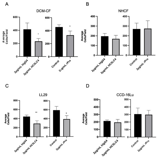 Cell surface PNC has a role in myofibroblast migration. Transwell permeable supports with a 6.5 mm polycarbonate membrane and 8 µm pores were coated with human fibronectin and used to separate the upper and lower chambers of a 24-well cell culture plate to measure migration of cells across the membrane (n = 4). Pathological myofibroblast migration is significantly reduced by h-α-PNC mAb (HC5LC4) and recombinant prodomain of N-cadherin (rPro) after 5 h; (A) DCM-CF, dilated cardiomyopathy myofibroblasts (C) LL29, IPF myofibroblasts. No significant effect on myofibroblasts isolated from healthy tissues was observed; (D) immortalized CCD-16Lu lung myofibroblasts from healthy donor (B) NHCF, normal human cardiac myofibroblasts. Two tailed T-test assuming Gaussian distribution analysis was performed to determine significance. (* p ≤ 0.05, ** p ≤ 0.01).