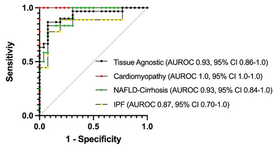 To evaluate the potential for plasma monitoring of PNC to serve as a biomarker for fibrosis development, ELISA-quantified plasma sampled were assessed using AUROC (area under receiver-operating characteristic) analysis and a 95% CI was obtained using the hybrid Wilson/Brown method. Samples were assessed for sensitivity and specificity on a tissue-specific (Figure 7; red, yellow, green lines) and tissue-agnostic (Figure 7; black line) basis. In each case, the AUROC is at least 0.87 (IPF) and in the case of cardiomyopathy, the AUROC is 1.0. While these data are encouraging, we caution that this is a small cohort of retrospective sampling, and further studies will be needed to validate the predictive value of plasma monitoring of PNC in patients with fibrosis.