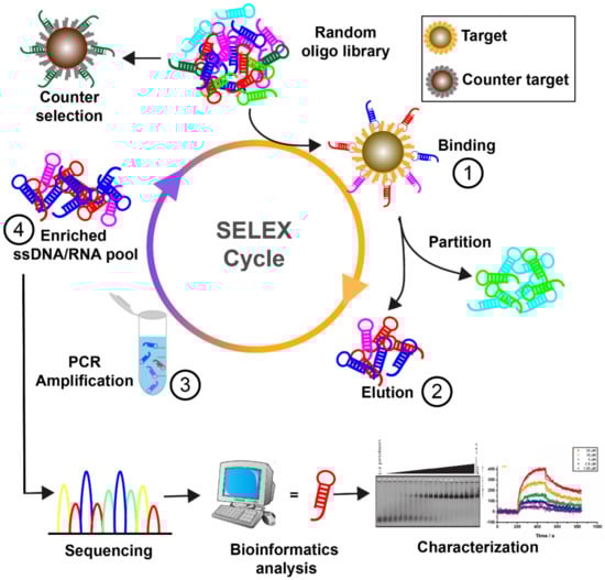 Illustration of the aptamer selection process. Typically, four steps are involved in the SELEX cycle. Step 1, the single-stranded DNA or RNA library is incubated with target molecules. Step 2, the bound sequences are separated from unbound strands and recovered for further process. Step 3, the target-binding sequences are amplified by PCR. RNA molecules need additional transcription procedures for amplification purposes. Step 4, single-stranded DNA/RNA sequences are re-generated from PCR products as a new library for the next round of selection. Through several iterative cycles, aptamers can be identified by sequencing and characterization assays.