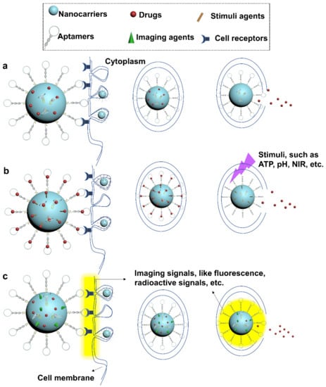 A variety of natural or synthetic nanomaterials have been developed for biomedical application including DNA nanostructures [], polymeric micelles [], silica nanoparticles [], gold nanoparticles or carbon nanotubes [,]. They are commonly used to develop favorable formulations for different therapeutic agents, particularly insoluble compounds or biotherapeutics [,]. The properties of biocompatibility, biodegradability, large loading capacity, and enhanced permeability and retention (EPR) effect, benefit such materials-based formulations. This can lead to prolonged circulation time, increased cellular uptake, and enhanced therapeutic efficacy []. However, most drug delivery materials lack specificity towards pathological targets, resulting in limited therapeutic effects and systematic cytotoxicity []. Therefore, functionalizing drug carriers with targeting moieties has become a focus of research. Aptamers have remarkable targeting specificities, so can benefit traditional nanocarriers through targeted delivery, increased drug permeability, reduced untargeted cytotoxicity, improved drug efficacy, and controllable drug capture and release [,]. Due to the large surface area, or EPR effects, some delivery materials in turn are able to enhance the functions of aptamers and protect them from nuclease degradation and quick filtration []. Moreover, the ease of introducing modifications on aptamers or nanomaterials, has further allowed researchers to design versatile drug delivery systems. Additive functions such as stimuli-responsive drug release and real-time imaging have been achieved in some aptamers-based drug carriers (Figure 2) [,]. Such progress holds promise for aptamer-functionalized materials for extensive therapeutic applications.