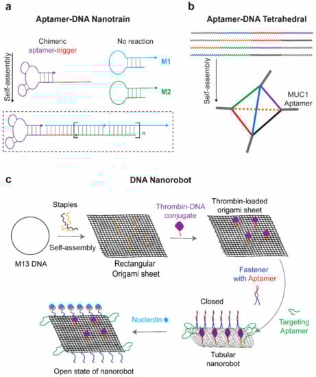 Schematic representation of DNA nanostructure assembly. (a) DNA nanotrain with aptamers assembled via complementary sequence. Modified with permission from reference []. Copyright 2013 PNAS. (b) Assembly of DNA tetrahedron through simple extension of strands. Modified with permission from reference []. Copyright 2019 RSC publishing. (c) Aptamer guided and gated the delivery of therapeutic drugs. Adapted from reference []. Copyright 2017 ACS publications.