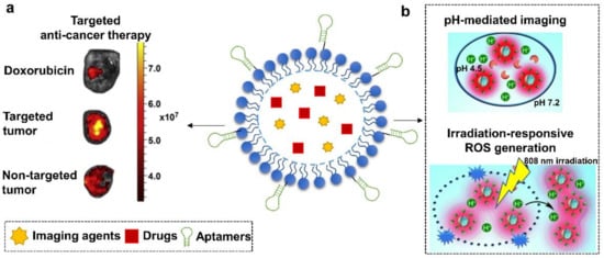 Through combining multiple functional elements such as imaging agents or responsive stimuli, aptamers-micelles nanoconjugates achieved more versatile applications. For example, in the work carried out by Tian et al. in 2014, a multifunctional aptamer-micelle drug nanocarrier was constructed via integrating a pH-activatable fluorescent probe (BDP-668) and a near-infrared photosensitizer (R16FP) [] (Figure 4b). Aptamers were functionalized to recognize target cancer cells, MDA-MB-231. The payload of R16FP was capable of mediating lysosomal destruction of target cells via generating reactive oxygen species (ROS) upon NIR irradiation. Meanwhile, the introduction of BDP-668 enabled the visualization of lysosomal pH change, thereby allowing to monitor the therapeutic progress in a real-time manner. This approach therefore might benefit cancer therapy through coupling precise drug delivery to imaging-guided therapy.