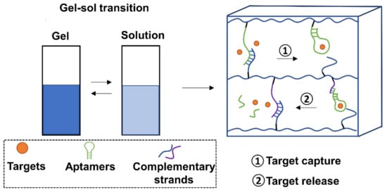 Schematic representation of the gel-sol transition of aptamer-decorated hydrogels. For target capture, aptamers in hydrogels would be de-hybridized from complementary strands to capture targets. For target release, aptamer-captured targets are released via a competitive hybridization from complementary oligonucleotides of aptamers or aptamer holders.