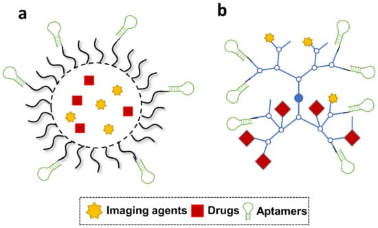 Schematic illustration of aptamer-functionalized polymeric nanoparticles and branched polymers. (a) Polymeric nanoparticles. (b) Branched polymeric nanostructures.