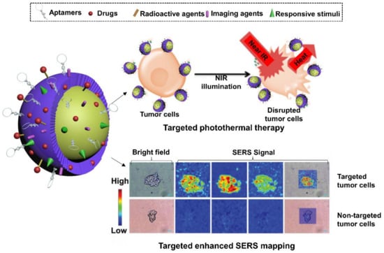 Schematic representation of aptamer-decorated gold nanostructures. They have been used to track A549-specifc tumors via gold-enhanced SERS imaging and kill tumor cells through NIR-triggered chemo-hyperthermia. It’s modified with permission from ref. []. Copyright 2019 RSC publishing.
