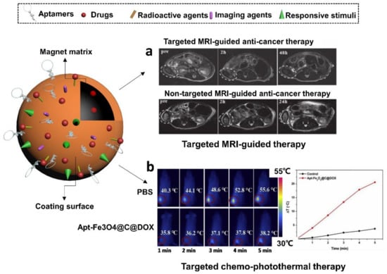 Aside from that, aptamers with remarkable tumor-targeting capability are able to enhance the PTT efficiency of magnetic nanoparticles in cancer therapy. The encapsulation of other non-magnetic payloads could further strengthen these composite nanomedicines by synergistic therapeutic effects. For example, Aravind et al. in 2013 achieved targeted chemotherapy, sustained drug release and optical imaging using aptamer loaded magnetic fluid and paclitaxel loaded fluorescently labeled poly (D, L-lactide-co-glycolide) nanoparticles (Apt-MF-NR-PLGA NPs) []. The aptamer was used to conjugate nucleolin, a protein with elevated expression associated to worse cancer prognosis. Apart from the targeted delivery of paclitaxel via the nucleolin-specific aptamer, the magnetic polymer vehicles could also induce hyperthermia or magnetically guide the particles to tumor regions. In a recent study conducted by Zhao et al. in 2019., authors created aptamer-functionalized Fe3O4@carbon@DOX NPs (Apt-Fe3O4@C@DOX) and demonstrated their application in the synergetic chemophotothermal therapy (CPTT) [] (Figure 8b). The sgc8 aptamer was used to functionalize the NPs to target the lung cancer model cell line A549. The Apt-Fe3O4@C@DOX NPs displayed both high photothermal conversion efficiency during PTT and pH/heat-induced DOX release. In vitro cytotoxicity assays indicated that the combined chemo-PTT approach shows greater toxicity toward lung adenocarcinoma cells (A549) than PTT or chemotherapy alone. Additionally, Apt-Fe3O4@C@DOX NPs presented decreasing contrast enhancement of MRI signals, meaning they have potential applications as contrast agents for MR imaging of tumor tissues.