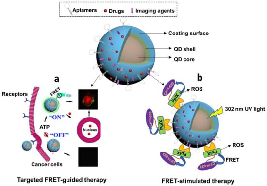 Quantum dots (QDs) are nanometer-sized semiconductor particles and present core-shell structures, which are composed of group II/VI elements such as CdSe and CdTe or group III/V elements such as InP and InAs [,]. They have gained extensive attention in recent years as fluorescent probes and energy mediators [,]. The inherent physicochemical properties endow QDs with impressive functions as robust fluorescent imaging agents and photosensitizer enhancers. Versatile QDs have been established by conjugating aptamer strands to achieve targeted therapeutic effects.