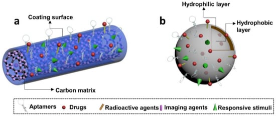 Schematic illustration of aptamer-functionalized carbon and liposome nanomaterials. (a,b) are aptamer-decorated versatile carbon and liposome nanomaterials, respectively.