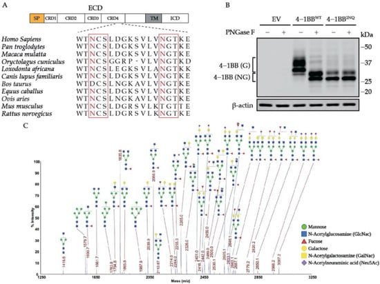 4-1BB is a heavily N-glycosylated protein with two modified sites. (A) Alignment of mammalian 4-1BB sequence around the N-glycosylation sites. The N-X-S/T motif is outlined by the red square. (B) Immunoblotting analysis of 4-1BB undergoing deglycosylation treatment by PNGase F. (C) MALDI-MS profiling of permethylated N-glycans released from PNGase F-treated recombinant 4-1BB protein. The masses of indicated glycan species represents the [M + Na+] values. SP, signal peptide; ECD, extracellular domain; TM, transmembrane domain; ICD, intracellular domain; CDR, cysteine-rich domain; EV, empty vector; 4-1BB (G), N-glycosylated 4-1BB; 4-1BB (NG), non-N-glycosylated 4-1BB.