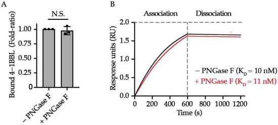 The impact of N-glycosylation on 4-1BB/4-1BBL interaction. (A) The relative level of bound 4-1BBL to PNGase F-treated and untreated 4-1BB protein (n = 3). (B) Octet analysis calculating the binding affinity of glycosylated (black) and deglycosylated 4-1BB (red) to 4-1BBL along with the KD values. N.S., not significant (Two-tailed student’s t-test).
