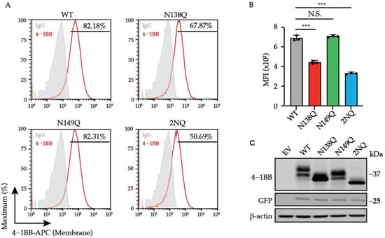 N-glycosylation is required for the membrane trafficking of many membrane proteins. To evaluate the impact of N-glycans on 4-1BB membrane expression, we established a panel of 4-1BB mutants with single or double mutation of its glycosylated asparagine sites (N138 and N149) and compared their total and membrane levels on Jurkat cells by executing flow cytometry and immunoblotting assays. The lentivirus vector with spleen focus-forming virus (SFFV) promoter was chosen because it promotes robust gene expression in hematopoietic cells []. A T2A-EGFP cassette was fused downstream of the 4-1BB coding region as a reporter monitoring the dose of lentivirus transduction (Figure S2). As demonstrated in Figure 3A–C, the single mutation of N138Q, but not N149Q, led to a notable decrease of membrane 4-1BB level without affecting the overall protein expression. Double mutation of the two sites (designated as 2NQ) further reduced 4-1BB membrane expression compared to N138Q alone. Additionally, according to immunoblotting analysis, the N138Q mutation caused more molecular weight decrease than N149Q, indicating that N138 was used to form a larger glycan architecture, which potentially harbors more impactful functions. We also confirmed that the antibody we utilized for flow cytometry staining (clone 4B4-1) does not distinguish glycosylated non-glycosylated 4-1BB in respect of binding (Figure S3), thus ensuring that the decreased membrane levels of glycosylation-deficient mutants were caused by the alteration of the protein itself. Hence, we proposed that N-glycosylation plays a role in transporting 4-1BB onto the cell membrane.