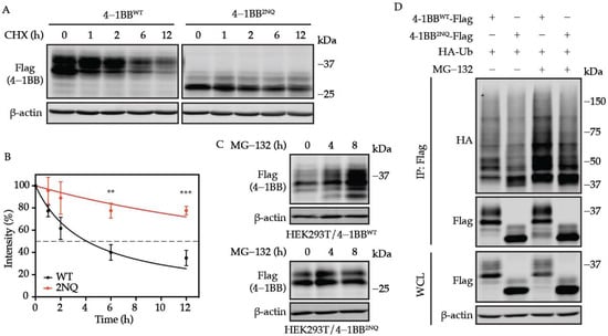 One of the best-characterized functions of N-glycosylation is to regulate protein stability [,]. Therefore, we compared the degradation half-life of 4-1BB WT and 2NQ to study the role N-glycan plays in the turn-over of 4-1BB. Interestingly, 4-1BB displayed dramatically increased stability in CHX-chase assay when lacking N-glycosylation sites, which is the opposite of many reported glycosylated immune receptors [] (Figure 4A,B). Unlike the WT, which was markedly upregulated upon proteasome inhibition, the 2NQ mutation exerted only mild accumulation upon the treatment of proteosome inhibitor MG-132 (Figure 4C), suggesting that ubiquitination targets 4-1BB for degradation. As demonstrated in Figure 4D, the 2NQ mutation of 4-1BB showed a decreased level of polyubiquitination compared to WT. Collectively, we concluded that N-glycosylation contributes to the rapid degradation of 4-1BB through the ubiquitin-proteasome pathway. According to our unpublished data, 4-1BB is ubiquitinated on its intracellular domain, which guides its proteasomal degradation. Some E3 ubiquitin ligases are known to ubiquitinate the glycosylated substrates by recognizing the N-glycan moieties []; however, since the extracellular N-linked oligosaccharide chains and the intracellular ubiquitination sites are separated by plasma membranes, the decreased ubiquitination observed on 2NQ is unlikely to be caused by insufficient E3 ligase binding out of glycan loss. Therefore, we investigated the potential mechanisms to explain the vastly increased stability of non-N-glycosylated 4-1BB.