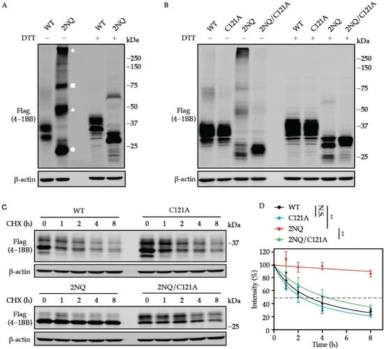 Protein oligomerization could be regulated by N-glycosylation [,]. Thus, we sought to examine whether the N-glycans present affect the multimer formation of 4-1BB. By performing non-reducing SDS-PAGE, we noticed substantially increased oligomerization was formed by non-glycosylated 4-1BB but not WT (Figure 5A). The ectodomain of 4-1BB is composed of four CRDs, which are the hallmark structures of the TNFRSF receptor family []. As illustrated by previous structural investigations [,], 20 out of 21 cysteine residues in the extracellular domain are used to form intramolecular disulfide bonds, which maintain the structural integrity of human 4-1BB. C121, the only unpaired cysteine, which is found in CRD4, can be used to create an intermolecular disulfide bond to stabilize 4-1BB dimers. As displayed in Figure 5B, the oligomerization of 4-1BB 2NQ was largely diminished when a cysteine-to-alanine mutation was introduced to C121. Likewise, the slow turn-over of 4-1BB 2NQ was also rescued by the C121A mutation (Figure 5C,D).