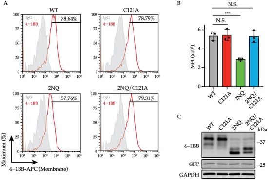 To further study whether the turn-over of 4-1BB is associated with membrane transportation, we compared the surface level of 4-1BB 2NQ with that of 4-1BB 2NQ/C121A. As shown in Figure 6A,B, in the absence of the C121-mediated disulfide bond, N-glycosylation-deficient 4-1BB exhibited comparable expression to WT, which is much higher than 2NQ. The overall expression of 4-1BB 2NQ and 2NQ/C121A are similar, despite the altered ratio of the two bands. By integrating the observations above, we proposed the model whereby N-glycosylation of 4-1BB hinders the C121-mediated multimerization, therefore allowing 4-1BB to be correctly delivered via the secretory pathway to the cell membrane, where it undergoes ubiquitination-triggered degradation.