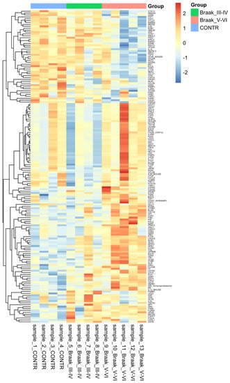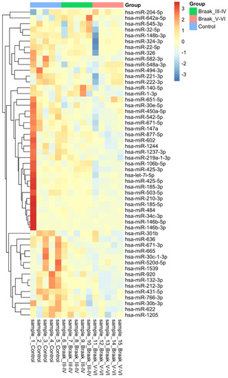 Fifty-four differentially expressed miRNAs (DE-miRNAs) were found, of which 14 were substantially different between control and Braak stage III-IV and 44 between control and Braak stage V-VI (Table 2). A further analysis comparing Braak stage III-IV versus Braak stage V-VI is available in (Supplementary Materials Table S1).