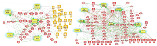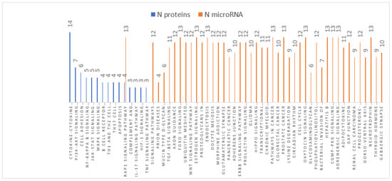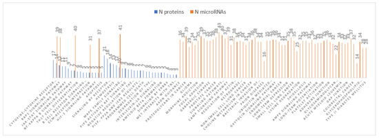 As part of our pathway analysis and gene ontology representation, we utilized the Elsevier’s PathwayStudio v. 10 (https://www.elsevier.com/solutions/pathway-studio-biological-research, accessed on 20 June 2021). This software handles high throughput “omics” data that can be interrogated for functional analysis and interactome assessment. For this purpose, differential proteins and altered miRNAs were evaluated using the propriety PathwayStudio ResNet database gene analysis. “Subnetwork Enrichment Analysis” (SNEA) algorithm builds functional pathways where Fisher’s statistical test is used to associate one differential hit (gene/protein/microRNA, etc.) to a specific molecular function, pathway, or biological process with the option of localizing these in cellular compartments. The association is categorized into protein modification targets, regulation targets binding partners, and expression targets.