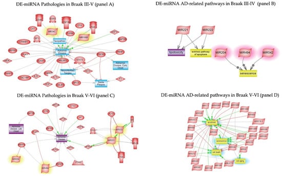 Pathway studio was interrogated to analyse DE-miRNAs and DE-proteins at early and late stage of AD. Figure 5 panel A shows the pathological processes triggered by Braak III-IV DE-miRNA. The most relevant AD pathways, namely lipotoxicity, apoptosis, and senescence, are shown in panel B of the same figure. The senescence pathway showed to be regulated by miR-204, one of the most significantly expressed miRs of early AD. In panel C and D, the pathological processes of miRNA targets and the main AD Braak V-VI pathway-related ones, including cell death, cell ageing, senescence, and apoptosis are shown, respectively.