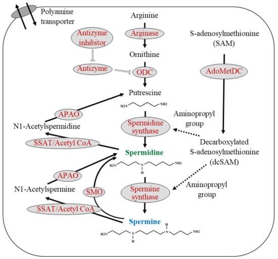 In addition to intracellular de novo synthesis, cells can take up polyamine from the extracellular space through a polyamine transporter in the cell membrane. The effects of extracellular polyamine on intracellular polyamine concentration are noticeable in cancer patients. Polyamine biosynthesis is upregulated in cancer cells, and therefore, polyamine concentrations are higher in cancer tissues than in normal surrounding tissues [65,66,67]. Circulating blood cells also take up polyamines synthesized in cancer cells; as a result, the blood cell concentrations and urinary excretion of polyamines, especially those of spermidine, are increased in cancer patients [65,67,68]. These levels decrease after tumor eradication and increase after relapse, indicating that polyamines synthesized in any part of the body, e.g., in cancer tissues, are transferred to blood cells [69].