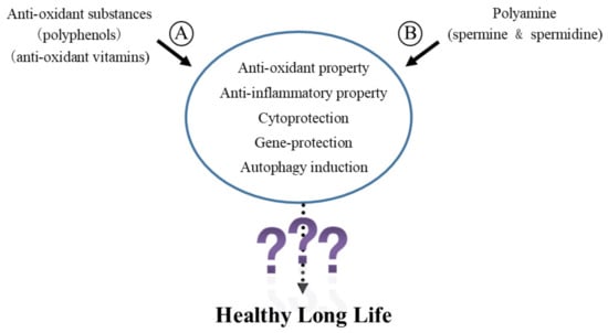 Biological activities of polyamine and polyphenols. Both polyamines (spermidine and spermine) and antioxidants such as polyphenols and antioxidant vitamins have anti-inflammatory properties, antioxidant properties, and protect cells and genes from harmful stimuli and activate autophagy. Despite the vast amount of research on antioxidants, most of the studies have failed to show any benefit in preventing age-related conditions or extending lifespan. Therefore, the biological activities described in the figure are not enough to achieve life span extension and inhibition of the progression of senescence, especially of mammals, even if the mechanism and/or the pathway by which polyamines and polyphenols elicit these biological activities are different. References for A circled: [17,18,19,20,21,22,23,25,26,28,29,30,31], References for B circled: [49,121,124,125,126,127,128,129,130,131,132,133,134,135,136,137,138,139,140,141,142,143,144,145,146,147,148,149,150,151,152,153,154,155,156,157,158,159], References for “?”: [22,25,26,27,28,30,31].