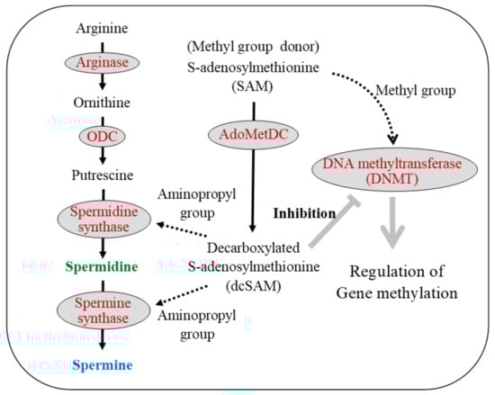 - Soda, K. Polyamine Metabolism and Gene Methylation in Conjunction with One-Carbon Metabolism. Int. J. Mol. Sci. 2018, 19, 3106. [Google Scholar] [CrossRef] [Green Version]
