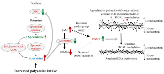 Continuously long-term increases in polyamine intake increased only spermine levels in the blood and suppressed aging-associated increases in proinflammatory conditions in humans and mice [53,56], i.e., suppression of LFA-1 protein levels on immune cells, and suppressed aging-associated enhancement of aberrant methylation of the entire genome and extended life span of mice [53]. These changes were associated with increases in blood spermine levels, and the degree of increase in the concentration of spermine was sufficient to make it biologically active in vivo. Increases in blood spermine levels are also sufficient to strongly suppress AdoMetDC activity, resulting in decreased dcSAM concentrations and increased SAM availability (Figure 4). The increase in SAM and the decrease in dcSAM that accompanies increases in spermine concentration activate DNA methyltransferase, which in turn regulates the DNA methylation status of the entire genome of brain tissue, tilting the LFA-1 promoter region toward hypermethylation and leading to a less pro-inflammatory state, i.e., reduced expression of LFA-1.