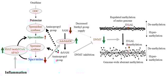 Due to the feedback mechanism, the activation of polyamine degradation by inflammation stimulates the enzymes of polyamine synthesis, and one of these enzymes, AdoMetDC, is also stimulated (Figure 5). Morrison LD et al. reported that autopsied brain of patients suffered Alzheimer’s disease showed an increase in the activity of AdoMetDC [294], also suggesting the involvement of chronic inflammation in the pathogenesis of the disease. AdoMetDC converts SAM to dSAM, and dSAM is used for polyamine synthesis. Thus, increased AdoMetDC activity decreases the SAM available for DNA methylation (Figure 5). Over the long term, this condition results in the progression of aberrant DNA methylation in the entire genome [295].
