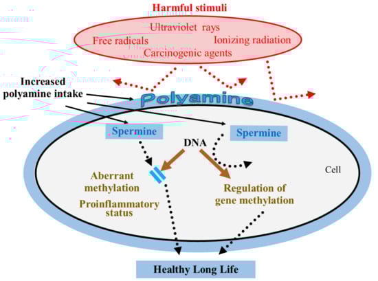 Bioactivities and mechanism of polyamines contributing to healthy long life. The mechanism by which increased polyamine intake inhibits onset or progression of aging-associated diseases and senescence. Increased polyamine intake elevates blood spermine levels in humans, in spite the fact that many foods contain spermidine much more than spermine. Polyamine binds to the cell membrane, proteins, and genes by electric charge. Polyamine (spermine and spermidine) protects cells and genes from harmful stimuli indicated in red. Spermine inhibits aberrant DNA methylation and regulates DNA methylation status. These biological activities contribute to a healthy longevity.