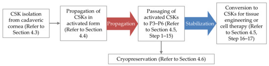 (* Note: To prepare CSKs for cell therapy in vivo, determine the cell number with a hematocytometer or an automated cell counter and calculate the required therapeutic density of the cells before adding the 1× PBS in the tube. Apply the cells in vivo within 30 min of preparation.)