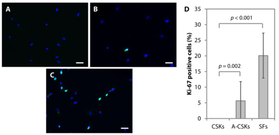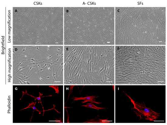The differences in the cell morphology can be identified using phase-contrast microscopy. The human CSKs show thinner and distinctly more round-ish cell bodies (Figure 4A,D) than the activated CSKs (Figure 4B,E). The CSKs also feature longer cellular processes than the activated CSKs. The SFs, which are converted from the CSKs by the addition of 5% FBS in the CSK complete medium, show broader cell bodies with shorter cellular processes than both the CSKs and the activated CSKs (Figure 4C,F). Further confirmation of phenotypic reversal of the cells can be achieved by staining with phalloidin. The human CSKs (Figure 4G) assume a more stellate morphology with a concentrated F-actin organization near the end of the cellular processes compared to the activated CSKs (Figure 4H). In stark contrast, the SFs are slender in shape and have a more bipolar morphology with larger cell bodies and an absence of cellular processes (Figure 4I).
