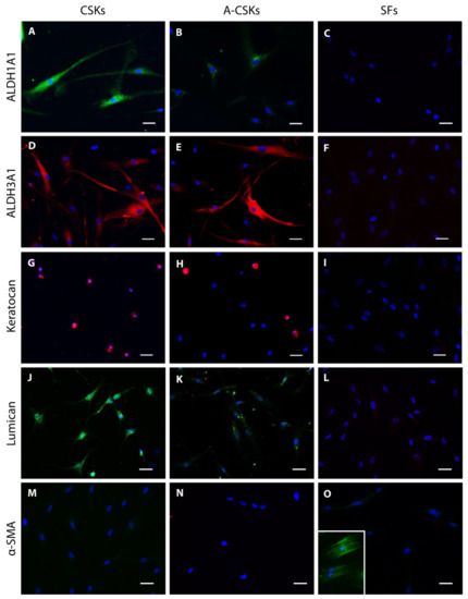 Figure 5. Protein expression of corneal stromal keratocytes (CSKs), activated CSKs (A-CSKs), and corneal fibroblasts (SFs). (A,D,G,J) Typical CSK markers, such as ALDH1A1, ALDH3A1, keratocan, and lumican were strongly expressed in the CSKs following 14 days of culture media switching to serum-free conditions. (B,E,H,K) In the propagation medium, the A-CSKs exhibited an attenuated expression of the CSK markers. (C,F,I,L) In contrast, in medium supplemented with 5% FBS, the SFs did not express or express only a little of the CSK markers. (M,N,O) All three cell types were not immunoreactive with α-smooth muscle actin (α-SMA), the cell marker of corneal stromal myofibroblasts (see inset in pane O). Scale bars = 50 μm.