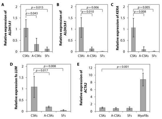 The differences in the ALDH1A1, ALDH3A1, keratocan, and lumican protein expression in the three cell types are usually reflected similarly in their gene expression. On RT-PCR, the expression of ALDH1A1 (Figure 6A), ALDH3A1 (Figure 6B), KERA (Figure 6C), and LUM (Figure 6D) is significantly lower in the SFs than in the CSKs. Similar to the protein expression found in the immunofluorescence staining, the activated CSKs display an intermediate expression of ALDH1A1 (Figure 6A), ALDH3A1 (Figure 6B), KERA (Figure 6C), and LUM (Figure 6D). No significant difference in the level of ACTA2 expression is found in the CSKs, A-CSKs, and SFs (Figure 6E). ACTA2 in all three cell types is significantly downregulated compared to MyoFBs (p = 3.16 × 10−5 vs. CSKs; p = 2.63 × 10−5 vs. A-CSKs; and p = 2.74 × 10−5 vs. SFs) (Figure 6E).