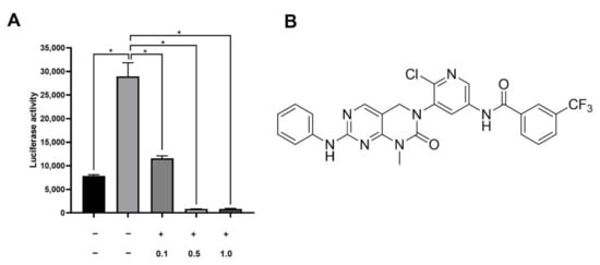 Multiple derivatives of N-(4-methyl-3-(8-methyl-7-oxo-2-(phenylamino)-7,8-dihydropyrido[2,3-d]pyrimidin-6-yl)phenyl)-3-(trifluoromethyl)benzamide, a type-2 kinase inhibitor interacting with the DFG-out conformation of the spleen tyrosine kinase (Syk) have been synthesized and screened by luciferase assay [19]. Further details on the molecular structure and synthesis of the tested derivatives are available upon request. The promoter region of human PD-L1 (−838 to +114) was inserted between KpnI and XhoI sites of pGL4.14-[luc2/Hygro] vector (Promega, Madison, WI, USA). After transient transfection of reporter plasmids to A549 cells using Lipofectamine 2000 (Invitrogen, Carlsbad, CA, USA), cells were treated with IFN-γ (20 ng/mL) and varying concentrations (0, 0.1, 0.5, and 1.0 μM) of inhibitors. After 24 h, cells were harvested, and luciferase activity was measured using the Luciferase Assay System (Promega).