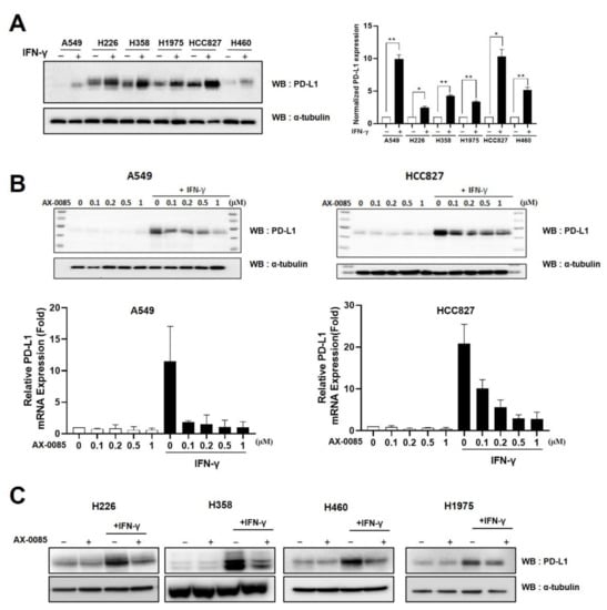 AX-0085 inhibits IFN-γ-induced PD-L1 expression. (A) Immunoblots showing up-regulation of PD-L1 expression with the addition of IFN-γ at 20 ng/mL for 24 h. LUAD cell lines used are indicated. ɑ–tubulin was used as the loading control. The graph on the right shows the results from the quantitative real time RT-PCR assay. Data are mean ± SEM of three independent experiments. Statistical significance is indicated (* p-value of <0.05, ** p-value of <0.01 from Student’s t-test). (B) Immunoblot showing inhibition of IFN-γ-induced PD-L1 up-regulation by AX-0085 in a concentration-dependent manner in A549 and HCC827 cells. Cells were treated with 20 ng/mL of IFN-γ for 24 h prior to application of indicated levels of AX-0085 for another 24 h. ɑ–tubulin was used as the loading control. Graphs at the bottom show results from the quantitative real time RT-PCR. Data are mean ± SEM of three independent experiments. Statistical significance is indicated (* p-value of <0.05, ** p-value of <0.01 from Student’s t-test). (C) Immunoblots showing changes in PD-L1 expression induced by sequential addition of IFN-γ (20 ng/mL) and AX-0085 (0.5 μM) as in (B). LUAD cell lines used are indicated. ɑ–tubulin was used as the loading control.