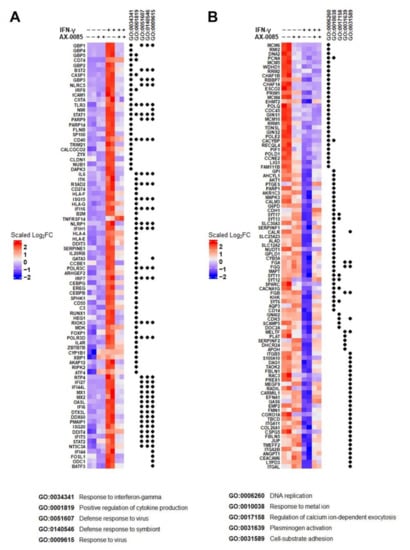 Transcriptomic analyses of IFN-γ signaling by AX-0085. Heat map representation of gene expression. Genes from the top 5 up-regulated (A) and down-regulated (B) GO term groups upon IFN-γ treatment are shown on the left in duplicates. The changes in their expression upon further treatment with AX-0085 are shown on the right. For GO IDs specified above, the groupings are indicated by black dots and terms are listed at the bottom (also listed in Supplementary Files S2 and S3).