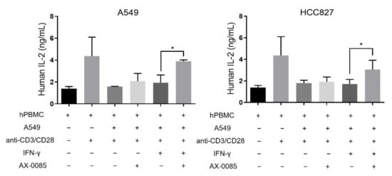 We proceeded to test the effect of AX-0085 on lymphocyte activation again using the two LUAD cell lines (Figure 5). Stimulation of PBMC with anti-CD3 and anti-CD28 antibodies led to increased production of IL-2. This activation was effectively abrogated when PBMC were co-cultured with A549 or HCC827 cells at 1:1 ratio. Importantly, when IFN-γ-treated LUAD cells were further treated with AX-0085, the levels of secreted IL-2 were significantly restored. This is consistent with IFN-γ mediated PD-L1 induction being inhibited by AX-0085, thereby allowing partial activation of T cells and consequent secretion of IL-2 (Figure 5).