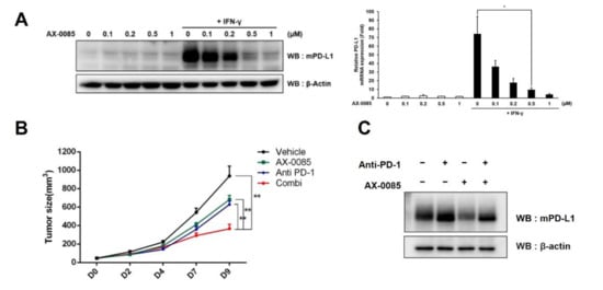 In order to test the efficacy of AX-0085 in vivo, we resorted to a syngeneic mouse model based on utilization of Lewis Lung Carcinoma (LLC) cells and C57BL/6 mice. First, we confirmed that LLC cells up-regulates PD-L1 expression in response to IFN-γ treatment and that AX-0085 down-regulates the induction of PD-L1 (Figure 6A). As in the case of human LUAD cells, inhibition of PD-L1 was shown to involve transcriptional inhibition, as seen by the down-regulation of the mRNA level (Figure 6A). LLC cells were injected to mice 10 days prior to the initiation of treatments, and mice were subsequently treated with (i) vehicle and IgG control, (ii) AX-0085 and IgG control, (iii) vehicle and Anti-PD-1 antibody, or (iv) AX-0085 and Anti-PD-1 antibody. AX-0085 was shown to have anti-tumor activity on its own as daily application at 10 mg/kg dosage inhibited tumor growth significantly. Similarly, anti-PD-1 antibody also had inhibitory effect on tumor growth, as has been previously reported [24,25]. Importantly, we saw a significant decrease in tumor size in mice treated with the combination of AX-0085 and anti-PD-1 antibody compared to those treated with either AX-0085 or anti-PD-1 antibody alone or with neither of the reagents (Figure 6B). We also examined the levels of PD-L1 using the protein extracted from tumor samples (Figure 6C). Treatment with anti-PD-1 antibody led to up-regulation of PD-L1 as has been reported previously, but the addition of AX-0085 visibly decreased PD-L1 expression [24,26,27]. This provides a mechanistic basis for the synergistic effect between AX-0085 and anti-PD-1 antibody in reducing the tumor burden.