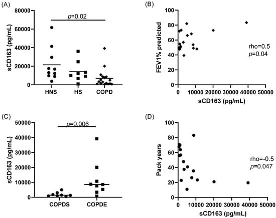 The levels of sCD163 were significantly lower in COPD patients compared to HNS (p = 0.02; Figure 1). There was a positive association between sCD163 and FEV1% predicted in COPD patients (rho = 0.5, p = 0.04; Figure 1) and when COPD patients and controls were combined (rho = 0.5, p = 0.0007; Figure S1). SCD163 levels were significantly lower in COPDS compared to COPDE (p = 0.006; Figure 1), and sCD163 levels were negatively associated with smoking pack-year history in COPD patients only (rho = −0.5, p = 0.047; Figure 1) and when HS were added (rho = −0.6, p = 0.004; Figure S1).