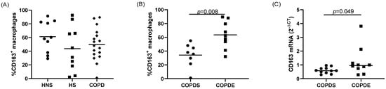 The percentage of CD163+ sputum macrophages was not different between COPD patients and controls (Figure 2). However, the percentage of CD163+ sputum macrophages were significantly lower in COPDS compared to COPDE (p = 0.008; Figure 2). We also examined CD163 gene expression in lung macrophages isolated from the peripheral lung tissue of a separate group of COPD patients; CD163 gene expression was significantly lower in COPDS compared to COPDE (p = 0.049; Figure 2).