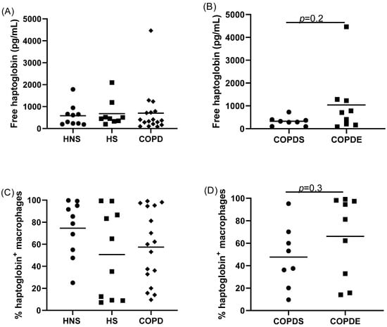 Sputum haptoglobin expression. The levels of haptoglobin were quantified in the sputum supernatants of n = 10 healthy non-smokers (HNS), n = 10 healthy smokers (HS) and n = 17 COPD patients by ELISA (A). Haptoglobin levels were compared between n = 8 COPD current smokers (COPDS) and n = 9 COPD ex-smokers (COPDE) (B). The percentage of haptoglobin+ sputum macrophages were compared between HNS, HS and COPD patients (C) and between COPDS and COPDE (D). Data are presented as individual values with mean.