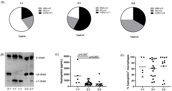Haptoglobin genotype in the study population. The numbers of individuals with genotype 2-1 or 2-2 are presented (A) with a representative blot indicating genotype identification in serum samples (B). The levels of haptoglobin in sputum supernatants (C) and haptoglobin+ sputum macrophages (D) were compared between the different genotype groups. Data are presented as individual values with mean.
