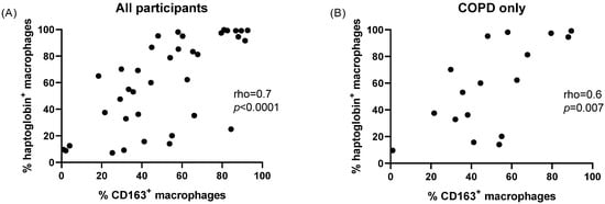 There was a positive correlation between the percentage of haptoglobin+ macrophages and the percentage of CD163+ macrophages when analysing all participants (rho = 0.7, p < 0.0001) and COPD patients only (rho = 0.6, p = 0.007) (both Figure 5).