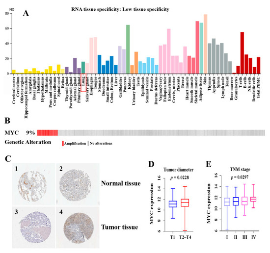High expression of c-Myc in LUAD and prognostic value. (A) c-Myc expression distribution in all tissues. (B) The distribution of c-Myc genomic alterations in TCGA LUAD is shown on cBioPortal OncoPrint plots. (C) Validation of c-Myc expression at the translational level by the HPA database, normal tissue (1 and 2), and tumor tissue (3 and 4). (D) Correlation analysis of c-Myc expression values with tumor size (T1 ≤ 3 cm, T2–T4 > 3 cm). (E) Correlation analysis of c-Myc expression values with TNM stage. The RNAs expression value was logarithmized with log2. p < 0.05 was deemed as statistically significant.