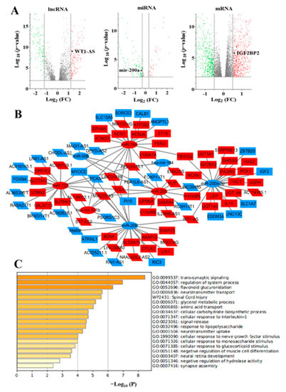 The c-Myc-related ceRNA network in LUAD. (A) The vocano plot of lncRNAs, miRNAs and mRNAs. Red stands for upregulation and green stands for downregulation. (B) The c-Myc-related ceRNA regulatory network in LUAD. The oval represents miRNAs, the diamond represents lncRNAs, and the rectangle represents mRNAs. Red stands for upregulation and blue stands for downregulation. (C) Functional enrichment analysis of mRNAs in the network.
